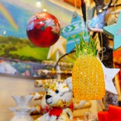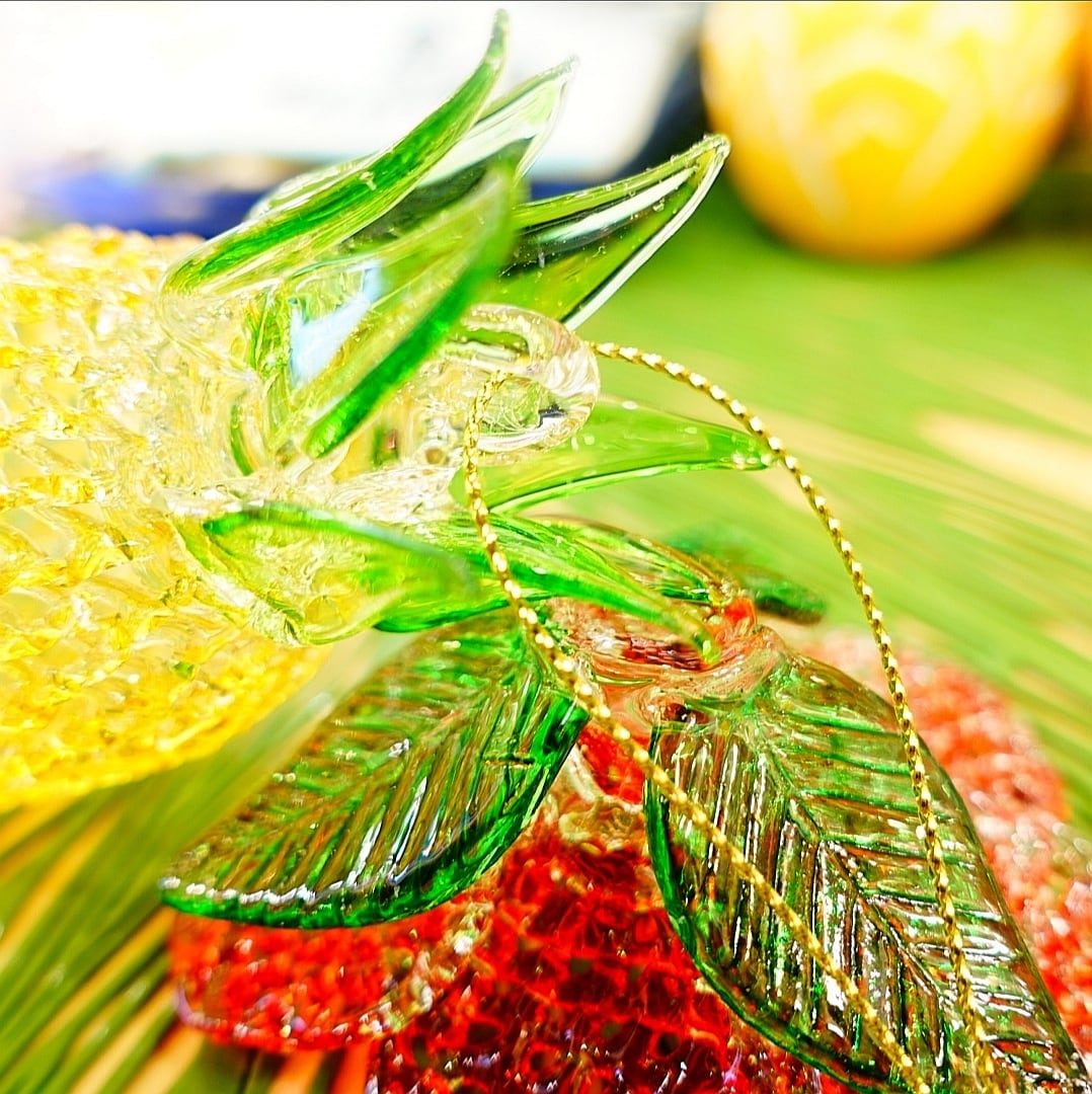 ガラス細工のパイナップルとハイビスカスオーナメントです。